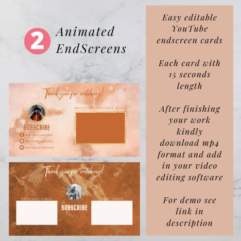 This bundle includes two animated end screen templates for your YouTube channel.